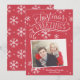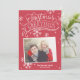 This photo holiday card features hand lettered and calligraphy artwork on a festive red background with snowflakes.