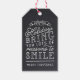 Custom printed holiday gift tags personalized with your photos and text. This fun two-sided design features cute hand-lettered style typography on a faux chalkboard background and red striped washi tape around your photo. The text reads "Hope the holidays bring you lots of reasons to smile". Personalize it with your photo, family name or other custom text. Use the design tools to edit the text fonts and colours, add more photos and create a unique one of a kind holiday gift tag.