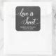 Trendy and cute wedding favour stickers with a pretty white typography text design that says Love is Sweet on a faux black chalkboard background. Personalized these cool labels with the name of the bride and groom and the date of the wedding.