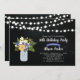 Célébrez votre journée spéciale avec cette élégante invitation d'anniversaire. Ce design comprend des lampes à cordes, des jarres de mason et un bouquet de fleurs avec un arrière - plan de tableau noir.