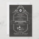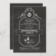 A trendy design in chalkboard black and white with a hint of vintage flair. Featuring a lovely swirl-top with a chef's hat and a decorative panel and banner. It's finished with a bottle and glass of wine next to a covered chafing dish.