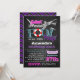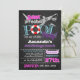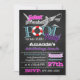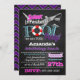 Chalkboard Shark Pool Party Birthday Invitations - feature a chalkboard background on the front in a nautical theme with life preserver and banner elements. Design features colours of hot pink, aqua, purple, grey, white and black. The main theme is a large silhouette of a great white shark at the top. The back features a matching chalkboard background with chevron print over top in shades of purple and white.