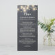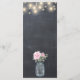 Chalkboard string light wedding menu features pink peonies in a mason jar.