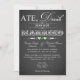 This vintage style typography grey and white chalkboard LOOK post wedding reception invitation has a variety of fonts with scrolls and romantic green hearts on it. It has a fun new take on the Eat, Drink and be Married trend, with a little play on words that say "Ate, drank, and got married" to reflect the earlier destination wedding event. It is shown here on basic paper. It is easily customized with your own information. There is some customizable text that you can edit the way you require. ALSO, please note that everything will print as it appears on your monitor. Zazzle will not edit anything for typos or mis-alignment etc., and I will not see it once you have ordered it. If you need help with your wording, please email me BEFORE you order. If there are any other items you need to make your event extra special, please email your request to niteowlstudio@gmail.com.