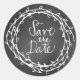 Rustic vintage style chalkboard looking round sticker, with white graphics of a vine wreath. White graphic text reads Save the Date. Matching wedding products are available.
