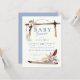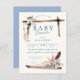 Boho arch with feathers, crystals, arrows, and flowers frame a delightful Baby Shower invitation. Backed with chambray blue background and arrows emblem. Perfect for any season. Your guests will anticipate a a fun and unique event. A little bit whimsy, a little bit Western, and a little bit rustic.