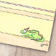 The last picture reveals what the pink line was. It is the same scene, only the picture zoomed out a little, so we can see that the pink line was in fact the tongue of a green chameleon, that is wearing a party hat, and is crouching in the bottom right corner of the card. The cake on the left is gone. The chameleon's tongue isn't visible anymore either, so that we as viewers guess that the chameleon swallowed it whole. Which explains its happy facial expression.