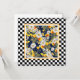 Beautiful and artistic image features tons of colourful white chamomile daisy and orange poppy flowers on black background with black and white chequerboard border