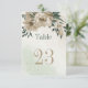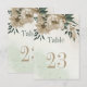 Unique table number card featuring romantic champagne flowers and green leaves.