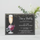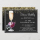 A modern New Years Eve modern holiday party invitation with champagne glass and gold glitter on a black background. Fun & Bubbly theme. Watercolor and gold glitter. Floral adorned champagne glass.