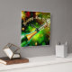 10.75” x 10.75” acrylic wall clock with a festive image of champagne spewing from a freshly popped bottle, amid confetti and green, red, and gold holiday lights. Gold orbs mark the 12, 3, 6, and 9 positions.
