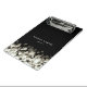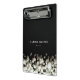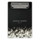 Chic black clipboard features two lines of custom text in modern white lettering, accented by a bottom border of luminous bokeh lights in shades of white and champagne. Design repeats on reverse side. Please note that this clipboard is a mini size; full size version also available in our Champagne Spark collection.
