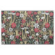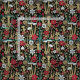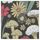 Ce tissu présente des champignons et des fleurs rouges, vertes et bronzés sur un arrière - plan noir.