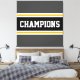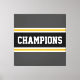 This colourful, sporty design features athletic CHAMPIONS text inside a wide black horizontal centre racing stripe with adjoining golden yellow and white stripes against dark grey outer edge stripes. The colours and text in this design can be personalized.