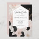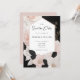 Chic, elegant save the date card, featuring a chanel-inspired design in black and white with blush pink accent flowers.