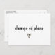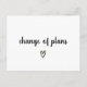Minimalist Wedding Postponement Announcement Postcard featuring a simple and cute design with the words, "change of plans" in a thick black script handwriting along with a hand drawn heart, over a white background. The text and background may be changed to any colours you wish. The backside has your personal message and return address for easy mailing. A chic and modern design to announce that your wedding has been postponed.