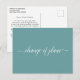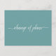 This simple postcard is an elegant and sophisticated way to let your guests know if you are in the unfortunate position of having to alter or postpone your wedding plans. The front is a pretty teal or turquoise colour and reads "change of plans" in elegant white script calligraphy, and the back has space for a custom note where you can explain the situation to your guests.