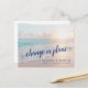 Beach Destination Wedding Postponement Notification Postcard to let your guests know that your wedding location or date (or both) has to be rescheduled or changed for any reason at all. The wording is vague enough so you don't have to share the reason, or edit the text to give a full explanation if you wish. The beautiful beach sunset features pretty ocean waves and modern calligraphy script fonts and a combination of different typography. Visit the Paper Grape Destinations Zazzle Designer Shop for more travel and beach theme wedding invitation, save the dates, and postponement announcements.