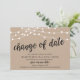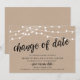 Ceci est une carte d'annonce de mariage reporté (report), avec le titre de la carte, Changement de date, en police de caractères script Black, design de ferme à lumières de chaîne Kraft Rustique moderne.