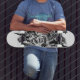 Version skateboard de l'oeuvre 'Chaos' Origin' avec des figures et des objets abstraits en noir et blanc. Il n'y a pas de sens à chercher mais on peut le trouver dans chaque coin.