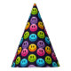 Une invitation dynamique et ludique à l'anniversaire avec un design psychédélique et d'inspiration rétro. L'arrière - plan sombre est décoré de formes colorées et tourbillonnantes, de lignes abstraites et de touches de couleurs vives rappelant les années 1970. La bordure est un motif amusant de visages souriants multicolores, avec des étoiles et des bulles éparpillées dans le design. Le texte est un mélange de polices audacieuses et ludiques, avec des détails clés surlignés en bleu vif et rose.