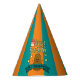 Des casquettes de fête d'anniversaire adorables pour égayer votre fête. Sur un arrière - plan orange, le design commence par le haut avec Joyeux Anniversaire en texte vert et jaune avec un gâteau avec givrage rose et trois bougies éclairées à côté du H en heureux. En dessous du texte est une jolie patate marron avec bras en bâton et un grand sourire. De l'autre côté de la pomme de terre se trouve une bannière bleue avec un modèle pour ajouter votre nom à personnaliser. Enfin, trois étoiles jaunes sont disséminées autour de la pomme de terre.