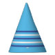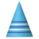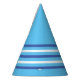 Des nuances de bleu casquette de fête avec des rayures bleu foncé et blanc sur le fond bleu oeuf d'un robin pour l'anniversaire d'un petit garçon ou un nouveau baby shower bébé garçon. Simple mignon casquette de corne de papier bleu.
