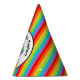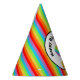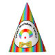 Célébrez en style avec ces casquettes de papier d'anniversaire clown de couleur arc-en-ciel. Ils présentent une illustration d'une perruque arc-en-ciel, d'un nez de clown rouge et d'une cravate arc-en-ciel à pois jaunes. Ces fournitures de fête sont prêtes à être personnalisées avec votre propre message.