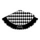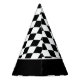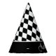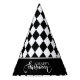 This party hat is shown in a black and white color harlequin diamond pattern with a Happy Halloween print.