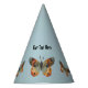 Ce casquette de fête en papier est bleu clair avec trois beaux papillons monarques bleus et oranges. Customisez votre texte avec le modèle.