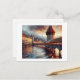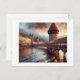 A picturesque scene features a historic covered bridge and stone tower reflecting in a vibrant river. The sky is dramatic with swirling brushstrokes of light and dark tones.