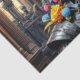 An intricate tissue paper design featuring a majestic skull clad in armour, adorned with vibrant, colourful flowers that bloom from its crown and shoulders. Set against the backdrop of a gothic church, with towering arches and dark, intricate details, this design evokes a haunting beauty. The contrast between the cold steel of the armour and the lively, delicate petals creates a sense of life and death intertwined. Perfect for decoupage projects, this tissue paper adds a touch of elegance and mystery to any creation.