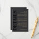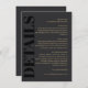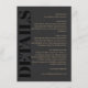 Elegant typography wedding details card in charcoal grey with tan text and details written in large black letters across the left side of the details enclosure card.