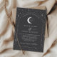 A celestial moon and star themed wedding invitation with a charcoal grey background and white text with elements. Customise the colour of the star pattern, background, arch fill and moon element!