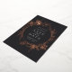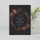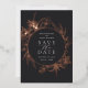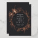 An elegant save the date design featuring your wedding details in chic off-white lettering, encircled by a floral border of rose gold foil lilies and foliage on a deep charcoal black background.