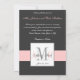 Charcoal Pink Three Letters Monograms Wedding Invitation Design by Elke Clarke ©2010. More designs available at WhiteWhimsicalWeddings.com and WhiteWhimsicalWeddings.blogspot.com. This is the front view. It is slightly more glossy than the back. If you wish to have the invitation text on the glossy side, cut it from the back view and paste it onto the front view.The art work is the same on both sides to suit this option. All colours, fonts, and graphics can be customized with your colours, spacing and font choices. This is not a template, but don't let that intimidate you. Zazzle has a very simple to use menu to help you and you can drag, drop, cut, paste etc. This allows you more flexibility in creating your own unique stationery. Just click the "Customize" option and follow the intuitive instructions. Customize with your monogram, names and wedding information. Also, choose from a variety of fonts and beautiful papers to make your wedding stationery FABULOUS! If you need help, contact me directly by the e-mail link on my home page which you can get to by clicking on the gallery name under the product. This size invitation accommodates the 4.5 x 5.25 inch card size Zazzle sells which is shown as the RSVP card below (also comes with envelopes)