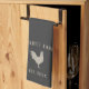 Celebrate life on the farm with this cute personalized kitchen towel featuring your family name or farm name and year established in soft tan lettering accented with a chicken illustration on a charcoal grey background.