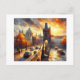 A vibrant Prague cityscape captures a bustling bridge over the Charles River, illuminated by a stunning sunset. The scene is lively with people and vehicles, set against a backdrop of historic architecture.