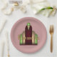 Set of eight 9” paper plates with an image of a glowing in maroon, pink, and green Art Deco design on dusty rose and optional text. This set of plates is named after the song Charleston by Arthur Gibbs and Paul Whiteman, number 20 on the top 100 songs of the 1920s. See matching candy jar, espresso cup, mug, pitcher, shot glass, teapot and coasters. See the entire Roaring 20s Plate collection in the FOOD/BEV | Dishes section.
