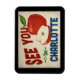 A charming Charlotte North Carolina vintage travel wall refrigerator magnet featuring a lovely red apple, along with fun retro style text that says, "See you in Charlotte"