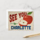 A charming Charlotte North Carolina vintage travel postcard featuring a lovely red apple, along with fun retro style text that says, "See you in Charlotte"