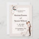 Faire-part de mariage romantique avec une illustration charmante de la mariée et du marié.L'arrière - plan est beige doux avec des feuilles délicats.Le design est beau et élégant, parfait pour un mariage romantique.