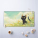 Bring the warmth and light of a sunny summer day to your office with this charming black cat desk mat. This delightful digital illustration features a cute, sleek black cat with captivating, large golden-yellow eyes, sitting attentively in a cheerful, lush light green meadow. The grass is dotted with numerous pristine white daisies, vibrant red-pink, and small yellow wildflowers, creating a fresh and bright foreground. The backdrop is an expansive and serene sky blue adorned with soft, luminous pale yellow clouds, suggesting a perfect, airy afternoon. This black cat desk mat is an ideal accessory for cat lovers, nature enthusiasts, and anyone seeking a joyful, high-contrast, and artistic way to personalize their computer setup with a sunny wildflower field scene.