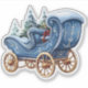 A beautifully designed blue carriage adorned with intricate patterns and a vibrant bow sits against a backdrop of snowy evergreen trees.