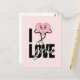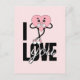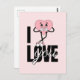 The heart, with its cute eyes and white-gloved hands, appears to be shyly embracing itself, adding an endearing quality to the card. It's as if the heart is blushing with the joy and bashfulness of love. The character is positioned in front of bold, black letters that spell out "I LOVE YOU," with the word "LOVE" stylishly written in a flowing, cursive script that overlaps the other letters, adding an artistic touch to the overall design.The "Charming Character Heart Valentine's Postcard" is more than just a postcard card; it's a fun and heartfelt way to show your affection. Perfect for all ages, it's sure to put a smile on the face of anyone who receives it.