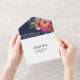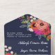 Charming floral all in one wedding invitation in navy blue with white fonts and colourful flower arrangements in coral, peach, orange, and hot pink with greenery and berries. The other side of the invitation, which will feature as an envelope, is white with another beautiful flower arrangement beneath the return address.