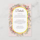 Charming Garden Floral Wedding Details Card featuring a soft pink background with elegant yellow-bordered floral accents. Perfect for sharing important wedding information such as reception, accommodation, and additional details with your guests. Customize easily to match your wedding theme.