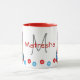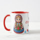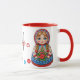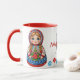Celebrate individuality and add a touch of whimsy and personalization to your day with our "Charming Matryoshkas with Personalized Touch Mug." Featuring two beautiful Russian Matryoshka dolls, this design showcases vibrant blue and red polka dots, accentuated by a classic red, white, and blue colour palette. Each doll is uniquely personalized with the initial of your choice, and name or text over it. This mug makes a perfect gift or a delightful addition to your own collection, combining cultural charm with a personal touch.