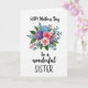 This card features a centered bouquet on a bright white background, arranged like a small celebration in bloom. Large clustered flowers in soft blue and deep lavender sit beside two roses, one coral pink and the other a creamy blush, leaning toward each other with a tender, close-knit feel ❤️. Smaller white and pale pink blossoms fill the gaps, adding a gentle, friendly softness to the arrangement. Teal-toned leaves and thin sprigs stretch outward, while tiny red berries dot the bouquet like little accents of warmth. The lighting is even and calm, keeping the colors softly blended and the edges airy rather than sharp. The message is placed above and below the bouquet in a flowing handwritten-style font, with the words reading “HAPPY Mother’s Day To a wonderful SISTER,” in a dark ink that stands out clearly. The top line sits centered above the flowers, and the lower line rests beneath the stems with generous white space around it 🌼. Blue and lavender petals cluster near the middle, with coral and blush roses slightly forward, and small red berries scattered around the outer edges.