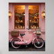 A beautifully styled pink storefront, featuring a vintage moped with a wicker basket, exudes charm and whimsy. The shop’s warm, golden interior highlights elegant pottery, creating a Wes Anderson-inspired aesthetic.